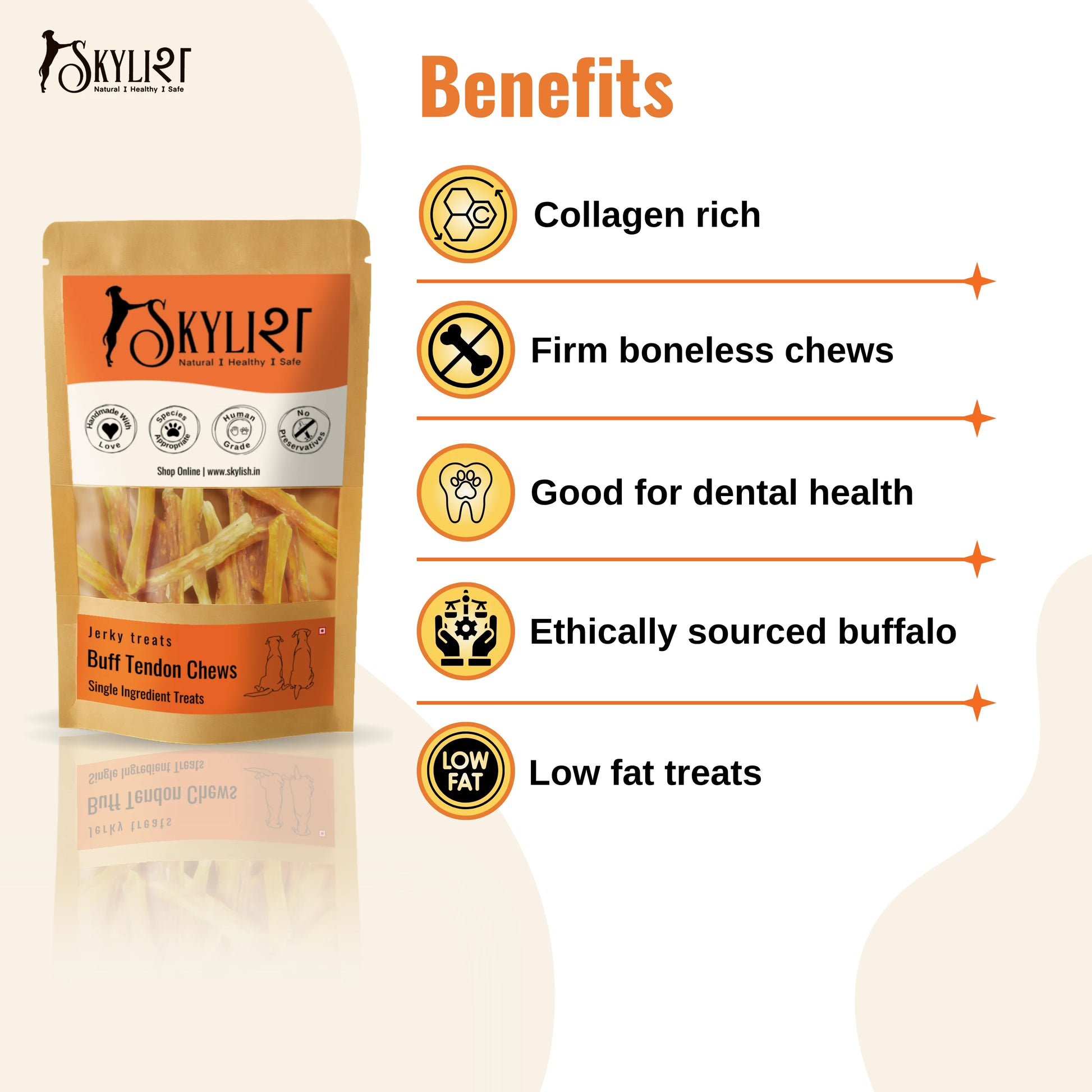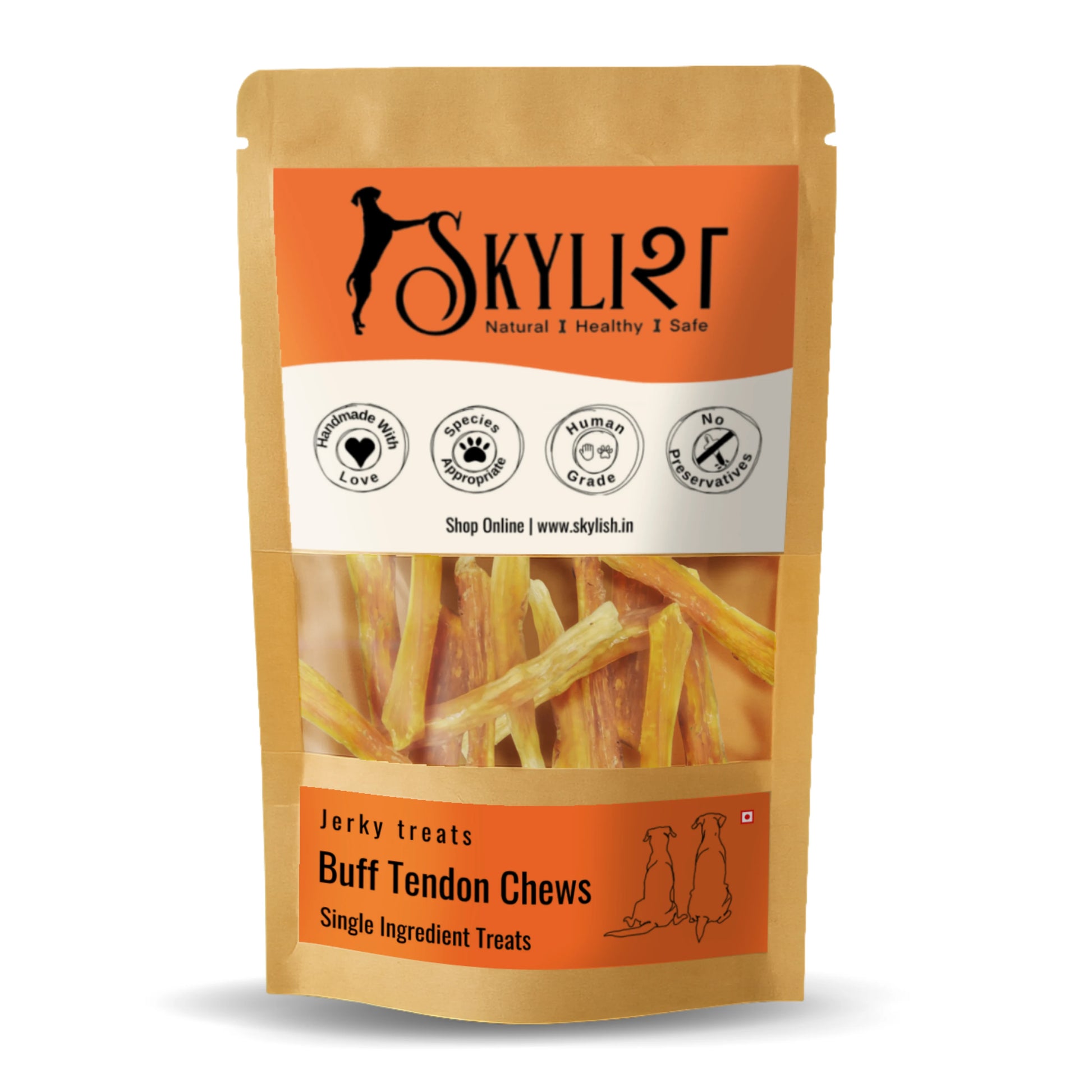 SKYLISH Buff Tendons | Dehydrated Boneless Chews| 100 % natural| Handmade with love Dehydrated Tendons are firm long lasting boneless chews made from the fibrous connective tissue that attaches muscle to bone. They are a collagen rich protein and may increase skin elasticity, durability, reduce signs of aging skin, and fortify cell metabolism. Buffalo is a low allergen meat source perfect for dogs with allergies.
